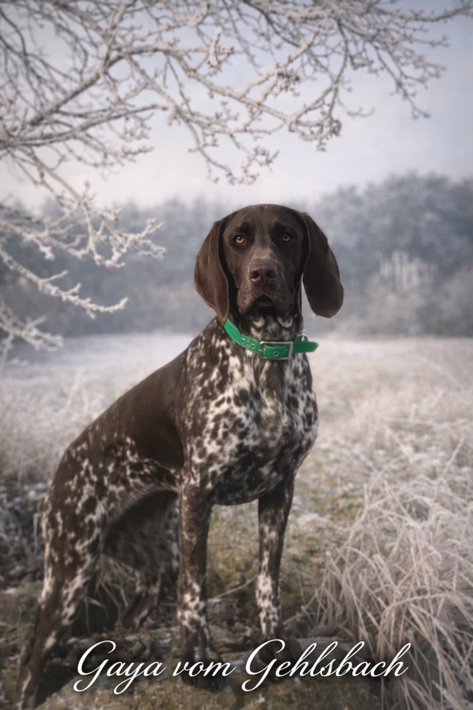 Gaya ist eine sehr elegante Hündin mit viel ausstarhlung. Gaya zeichnet sich durch Ihre gute Nasenarbeit und Ihren ausgeprägten Finderwillen aus. Sie ist gegenüber Raubwild absolut kompromisslos. Gaya ist ein Hunde die gefallen möchte. Sie Ihre Jagd erfolgt Sicht- und Spurlaut. Wie auch ihre Geschister, ist sie ein toller Sauenjäger. Den Saujager bekam Gaya auf der 2. Drückjagd bestätigt. Jetzt ist das nächste Ziel die VGP. VJP 71 Punkte, D1,S1,SJ, Btr. Spl. Sl.HN, BP,Fw. SG Jk HD A2